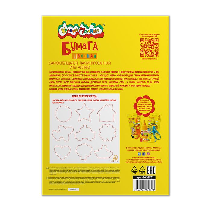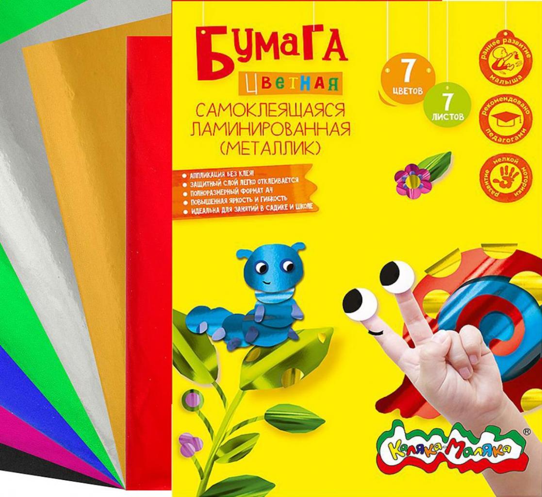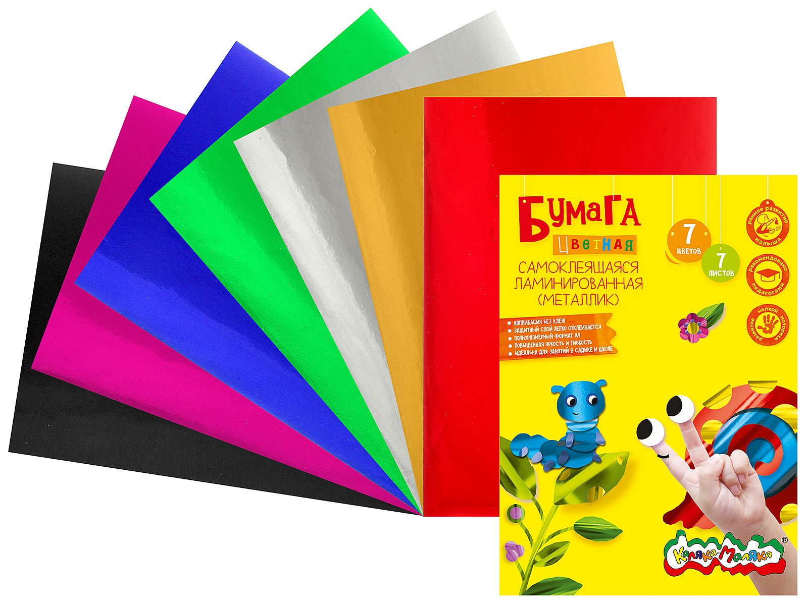 Бумага цветная самоклеящ. ламинированная 7 листов 7 цветов А4 210х297 мм в папке Каляка-Маляка