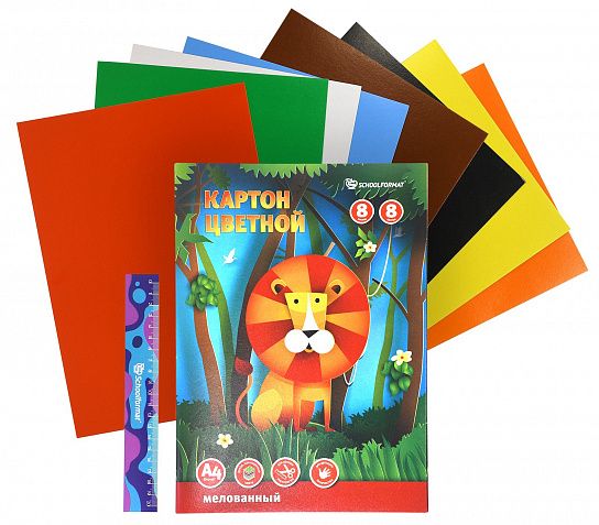 Картон цветной мелованный А4, 8 цветов 8 листов, 210 г/м2, в папке