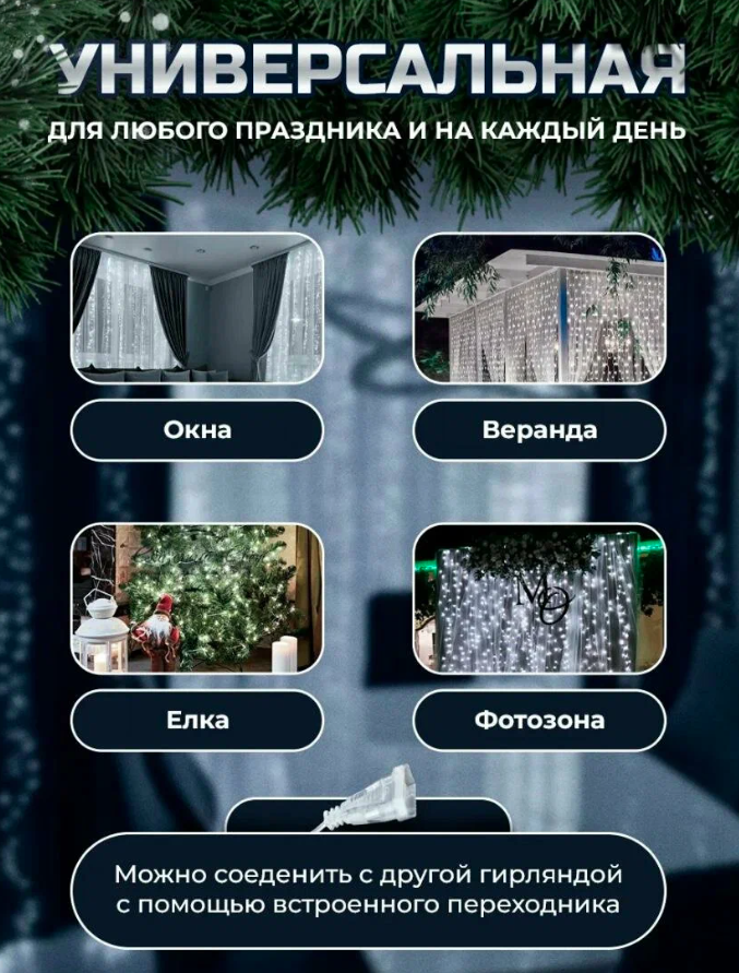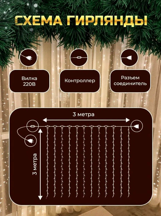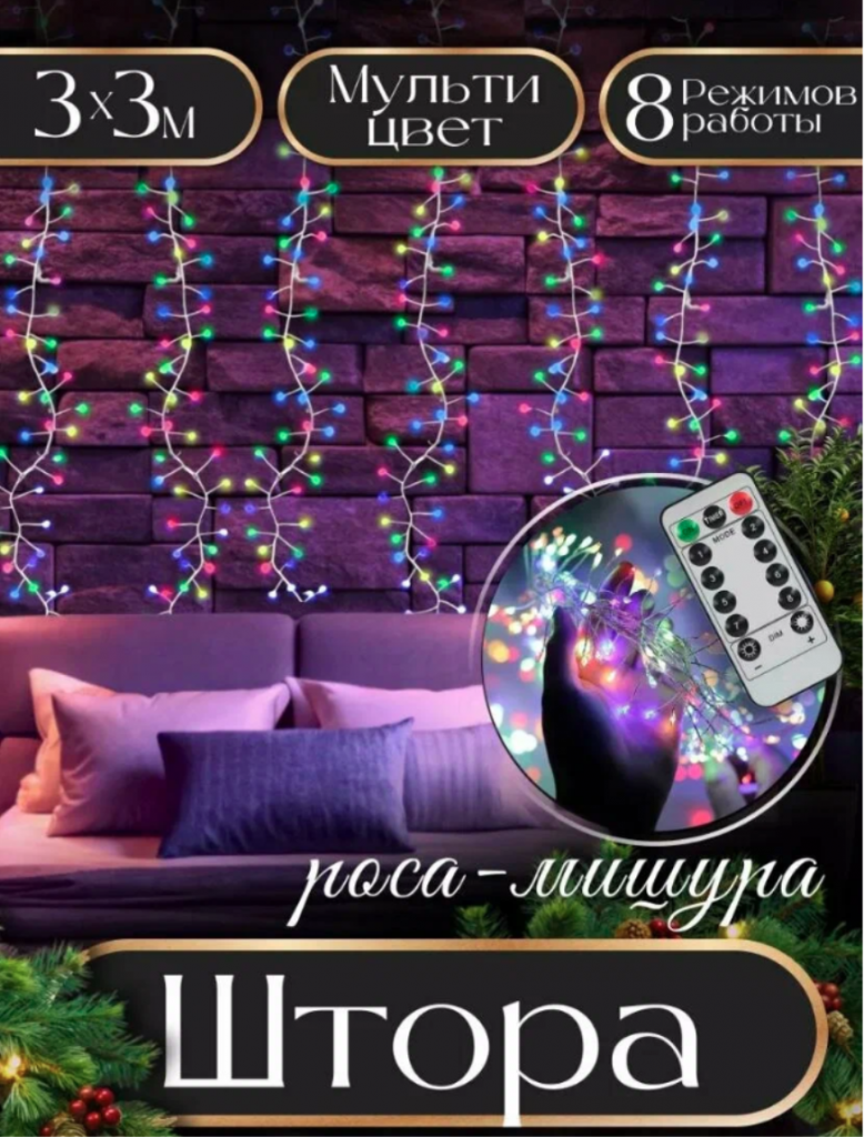 Гирлянда новогодняя светодиодная штора, занавеска "Роса мишура" 3х3 м, с пультом, 8 режимов , цвет мульти (разноцветный)