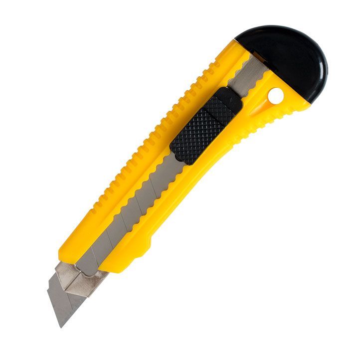 Нож канцелярский усиленный в блистере, с металлическими направляющими. Лезвие из высококачественной стали, выдвижное, многосекционное.