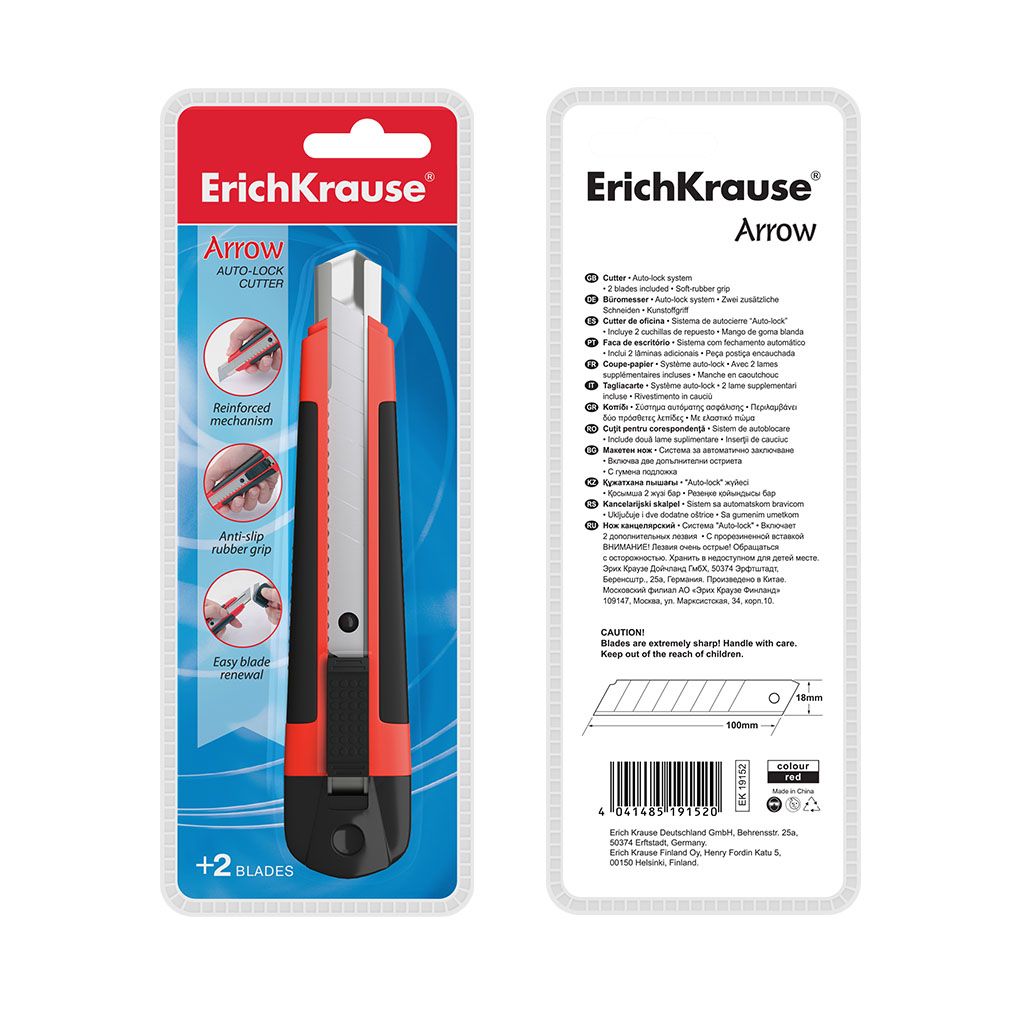 Нож канцелярский ErichKrause ARROW 18 мм, с автоматической фиксацией, 2 запасных лезвия, красный