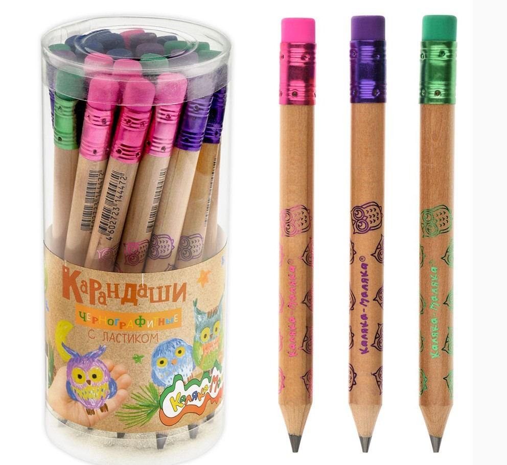 Чернографитные карандаши, созданные специально для малышей имеют специально разработанный размер — 2/3 стандартного и утолщенный диаметр, чтобы его можно было удобно держать в ручке. Круглый корпус без краски и лака обеспечит безопасность маленьким художникам. А веселые разноцветные совы и огромные разноцветные ластики развеселят юных творцов.