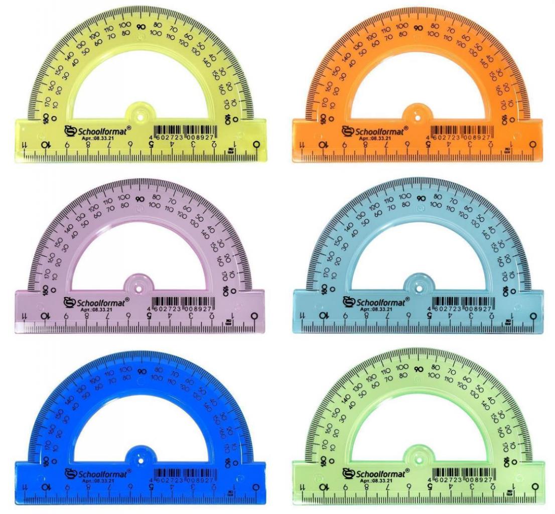 Транспортир 180° из прозрачной пластмассы с градуированной шкалой.