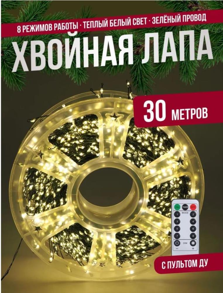 Гирлянда нить МИШУРА, хвойная лапа, (провод ЗЕЛЕНЫЙ) с ПУЛЬТОМ, свечение теплое - желтое