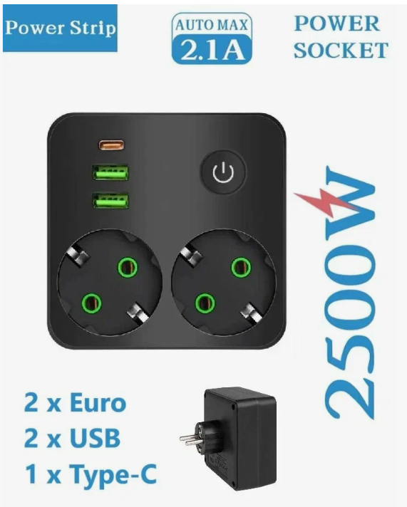 Тройник (с двумя розетками) черный с 2USB+1Type-c с 5-ю отверстиями 1-выключатель 2500 Вт-3600 Вт