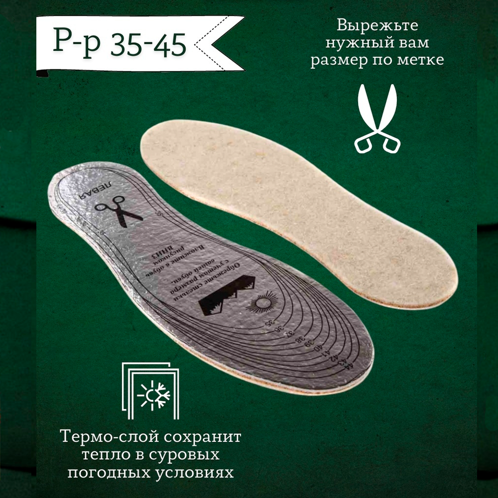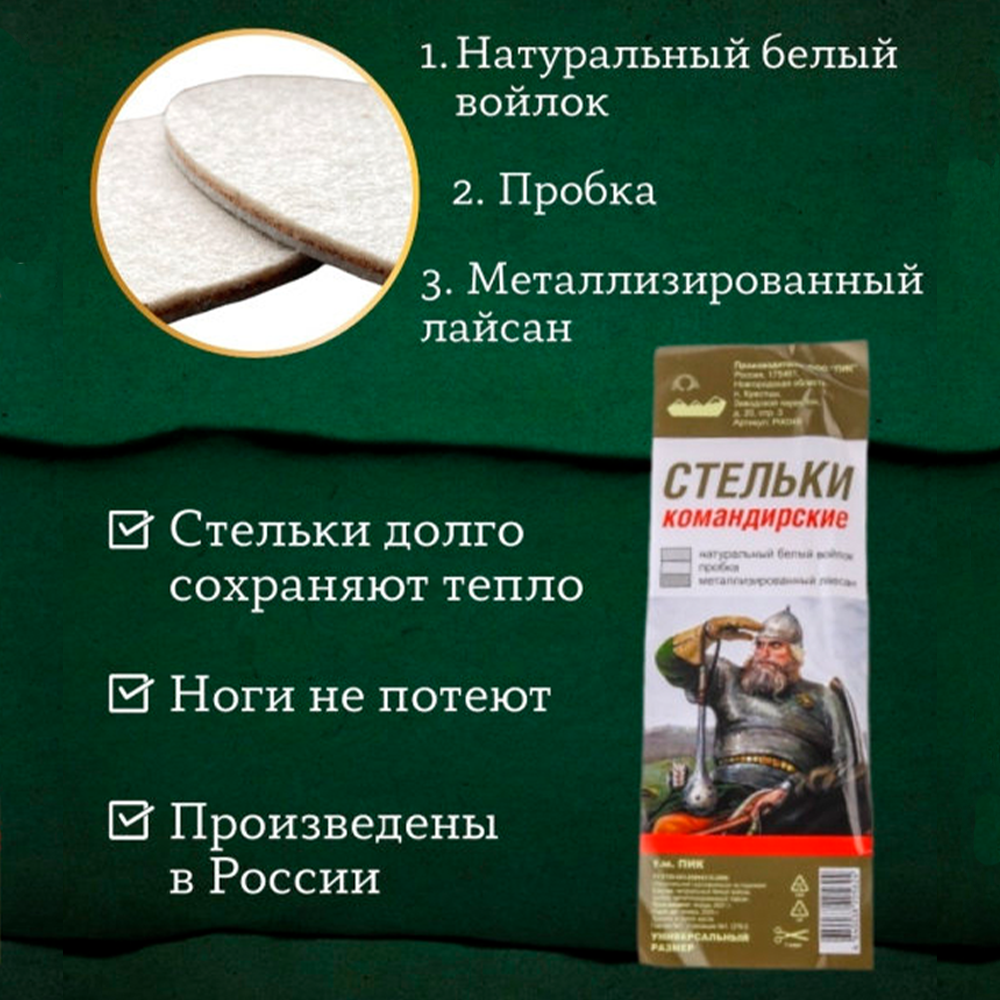 Как показывает практика, заводские стельки которые идут вместе с обувью, не обладают нужными теплоизоляционными свойствами... Стельки зимние командирские - очень полезный и необходимый аксессуар в условиях суровой российской зимы. Изготовлены по 3-х слойной технологии: нижний слой - металлизированый лавсан, средний слой - пробка, верхний слой - натуральный белый войлок. Стельки имеют универсальный размер (от 35 до 45), на обратной стороне стелек нарисован шаблон, по по которому вы без труда вырежете нужный Вам размер. Произведены в России.